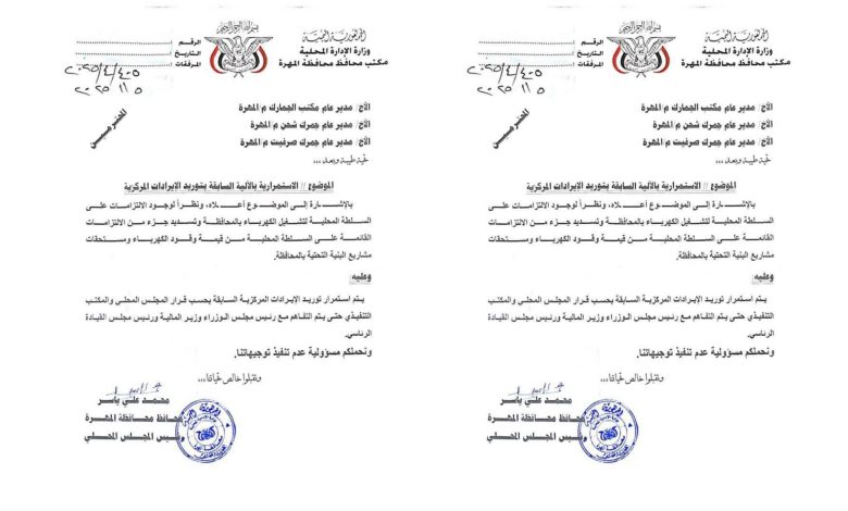 المهرة _ كشفت وثائق رسمية عن توجيهات صادرة من محافظ محافظة المهرة، محمد علي ياسر، إلى إدارة جمرك منفذ شحن، بشأن آلية توريد الإيرادات المالية وفق خطة السلطة المحلية، في إطار تنظيم عملية التحصيل وضمان الاستفادة من الموارد في دعم القطاعات الخدمية بالمحافظة.